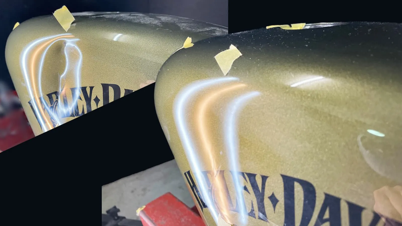 バイクタンクの凹み修理はオリジナル塗装を残したまま。