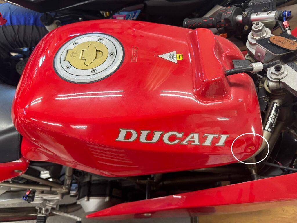 ドゥカティ900SL 1993年式 バイクタンクのまたいで右側前方の角に2連打の傷がある凹みです。32年前のオリジナル塗装のままのバイクタンクのようですが、バイク屋さんでは「パテ補修しかないでしょう」と言われたそうです。しかしながら、弊社のバイクHPをご覧頂き、バイク購入の際に広島県からご依頼頂きました。