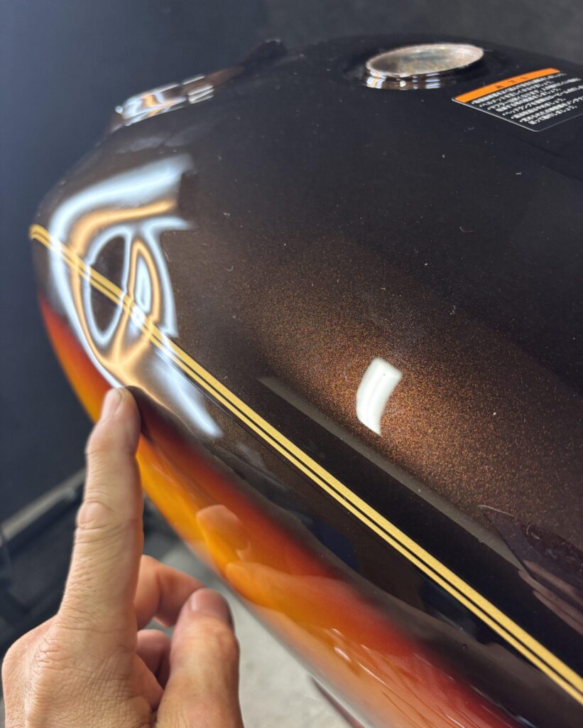 ヤマハ ドラッグスター250のリペイントしたバイクタンクをデントリペアした修理事例です。板金塗装を検討する前に、デントハリマにご相談ください。バイクの凹み修理専門、デントハリマは全国宅配で修理可能です。 -